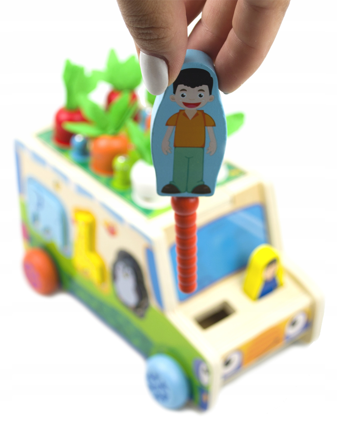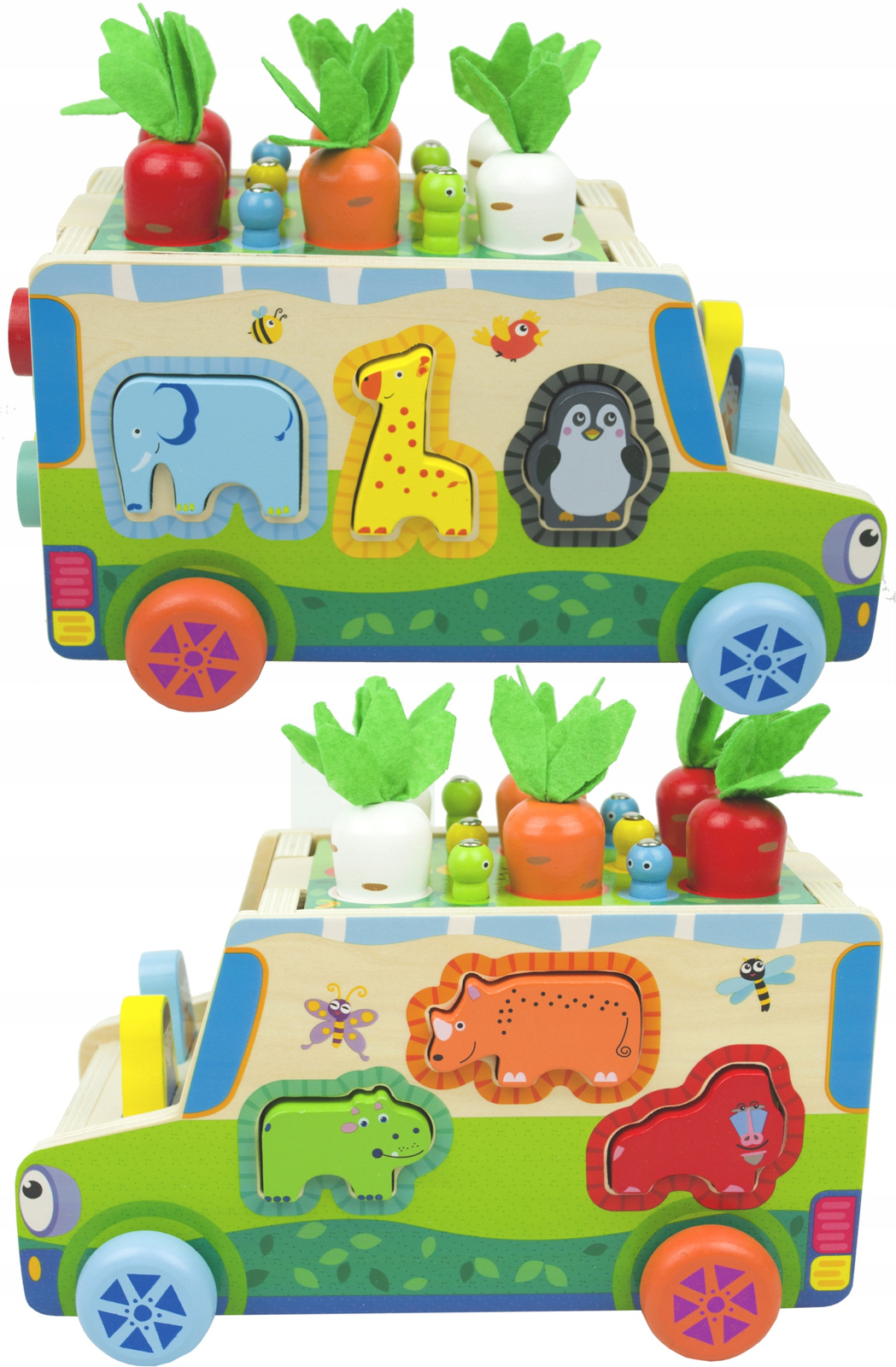 słoń, żyrafa, pingwin, hipopotam, nosorożec, małpa. Każdy klocek posiada odmienny kształt oraz grafikę, co daje pozytywny wpływ na wrażenia sensoryczne malucha. Zabawa polega na uratowaniu warzyw przed głodnymi, kolorowymi robaczkami, które chcą zjeść je wszystkie. Dzięki wbudowanym magnesom chłopiec i dziewczynka wyciągają robaczki, które przyczepiają się do nich. Po skończonej zabawie wszystkie klocki i figurki można umieścić w sorterze i bawić się nim jako pojazdem.