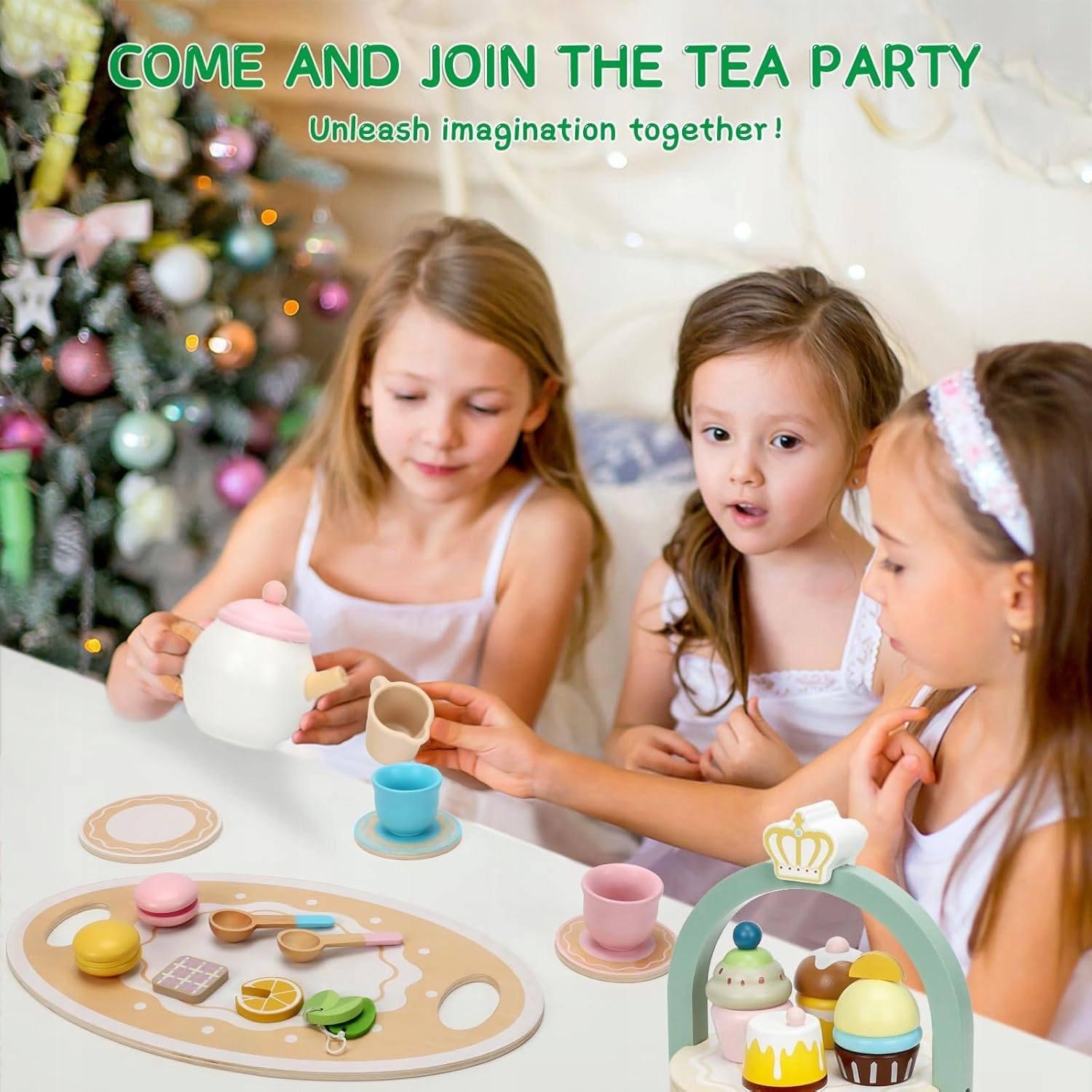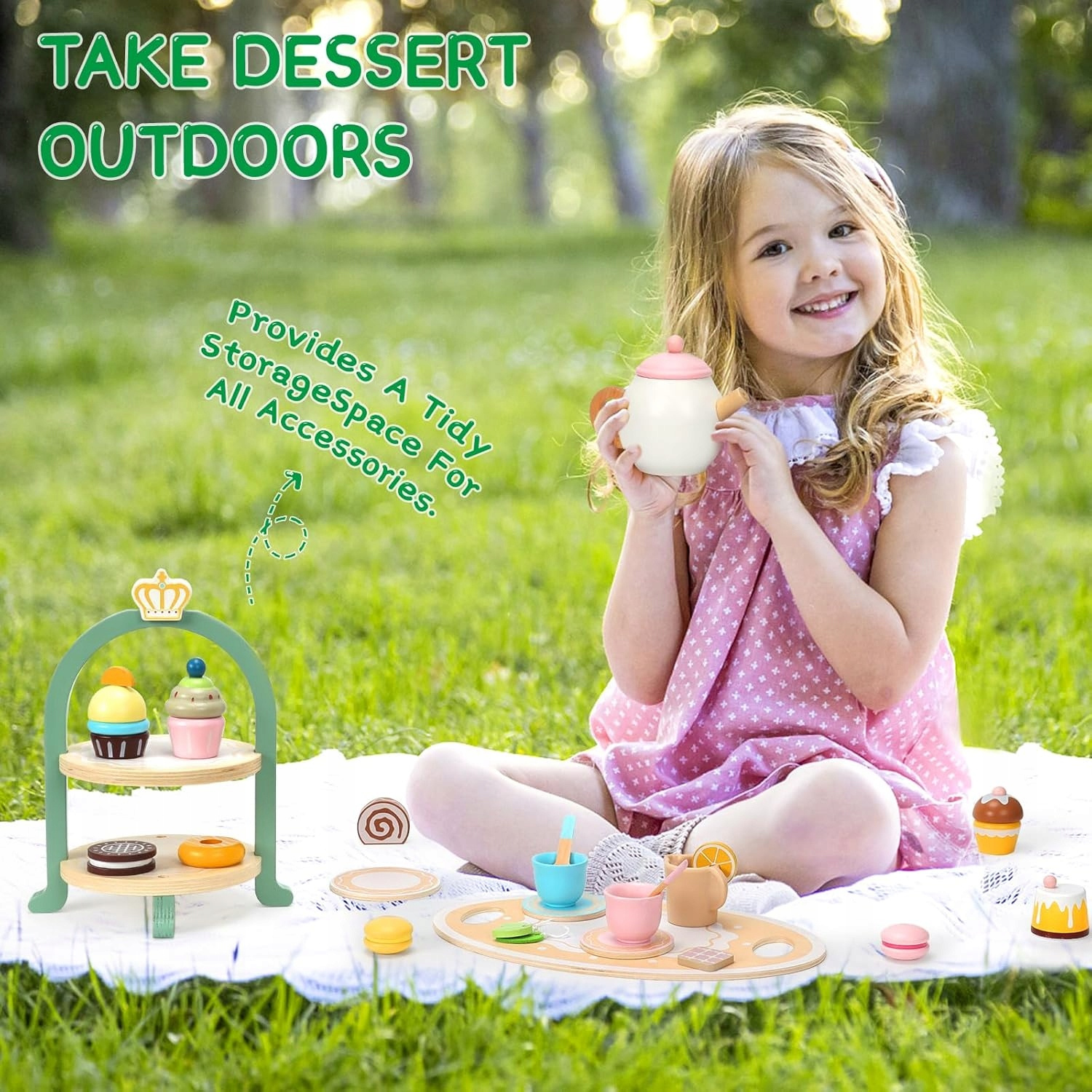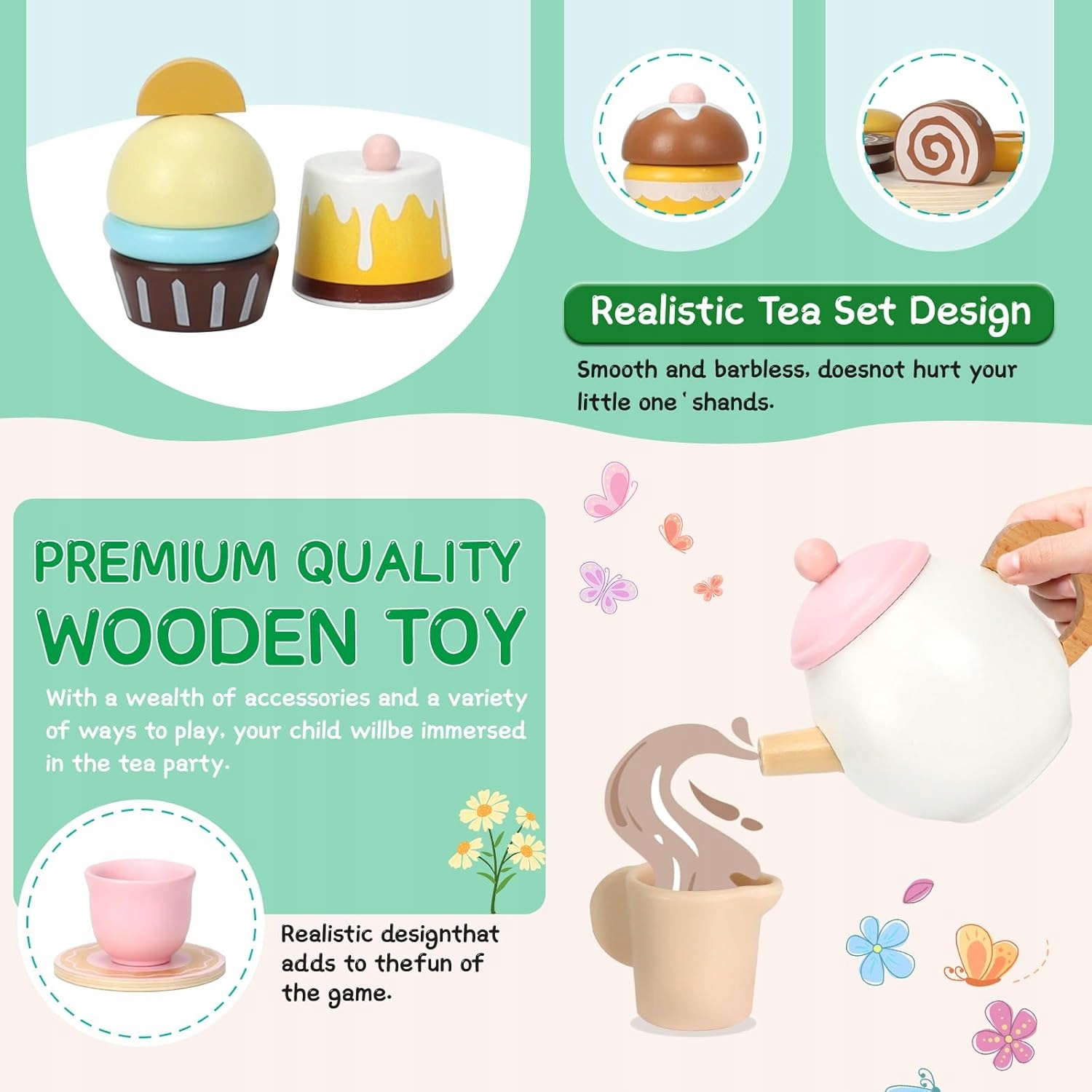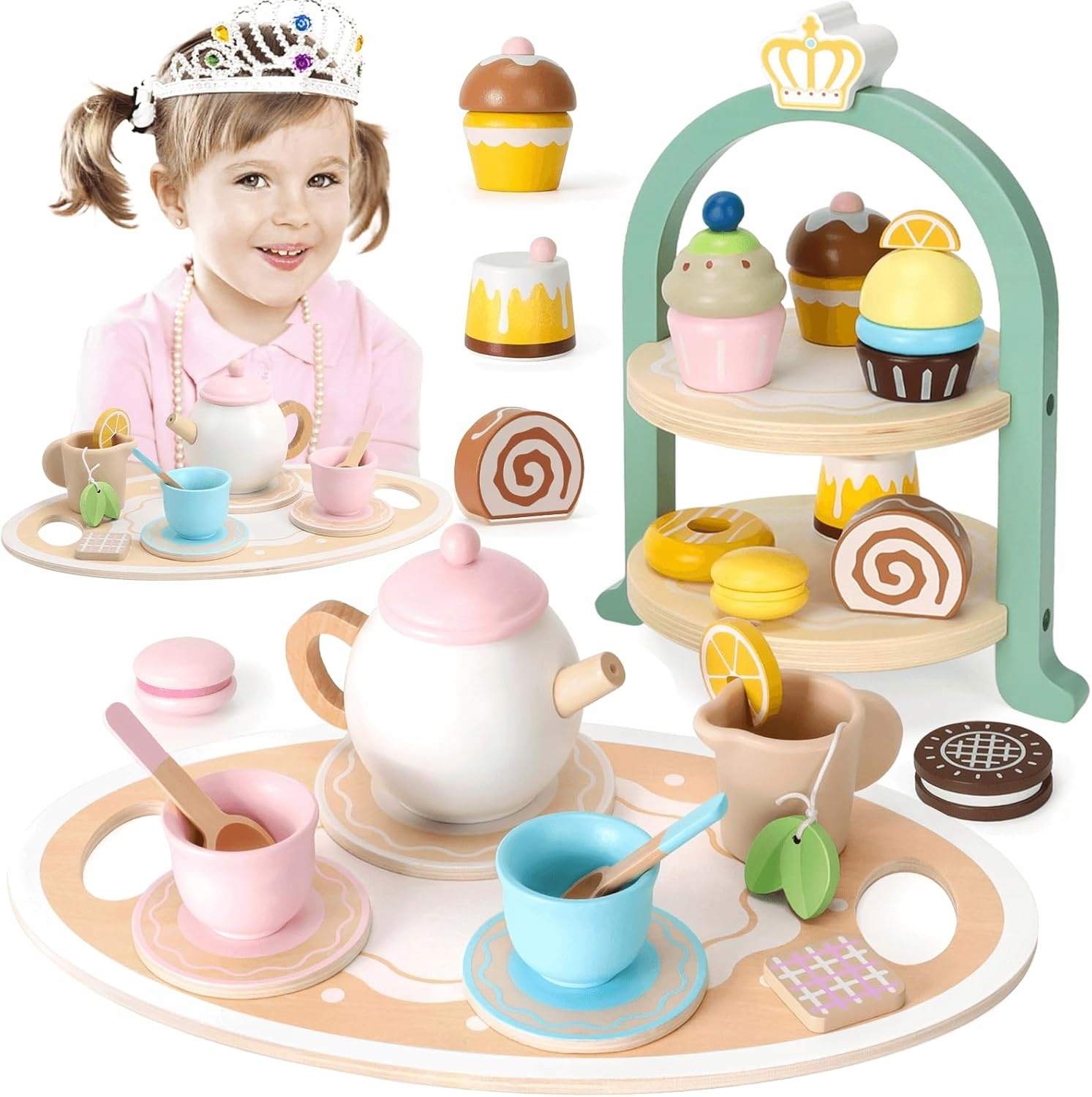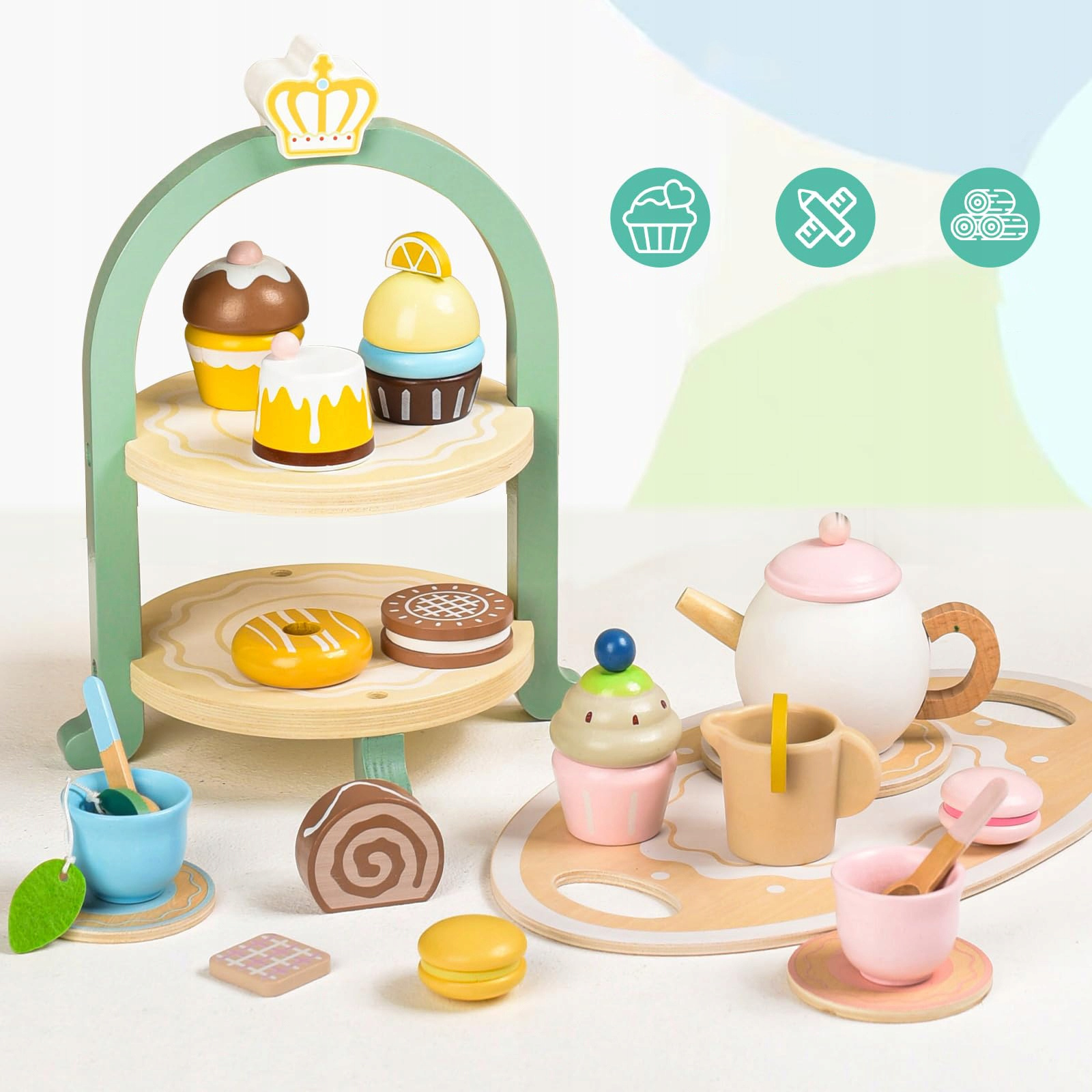 Ten drewniany dziecięcy zestaw kuchenny jest w pełni wyposażony, zawiera 1 drewniany stojak na babeczki, 1 tacę do herbaty, 1 czajniczek, 2 filiżanki, 2 łyżki do mieszania, 3 spodki, 1 dzbanek do mleka, 5 muffinek, 5 różnych deserów, 1 plaster cytryny, 1 torebkę herbaty. Nasz zestaw kuchenny z akcesoriami do herbaty dla dzieci zawiera wszystko, czego dzieci potrzebują, aby zorganizować małe przyjęcie herbaciane.