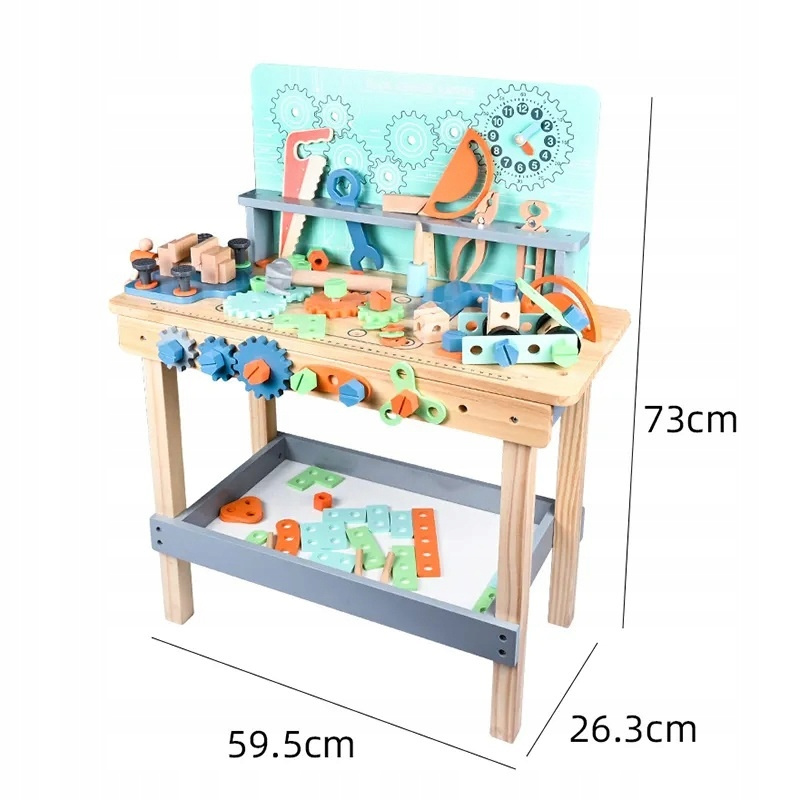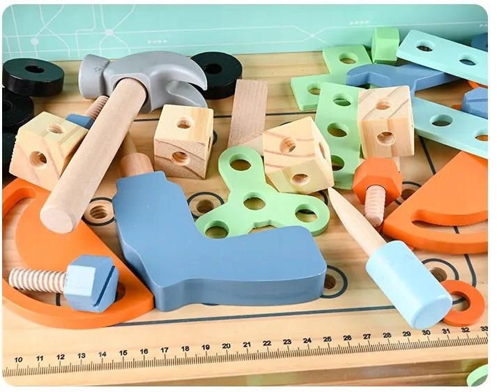 8 realistycznych drewnianych narzędzi: stół warsztatowy dla dzieci zawiera 8 drewnianych narzędzi, w tym piłę, śrubokręt, młotek, imadło i dwa klucze. Dzięki temu Twój maluch będzie mógł nauczyć się obsługi podstawowych narzędzi i poprawić swoją zręczność i koordynację ruchową.