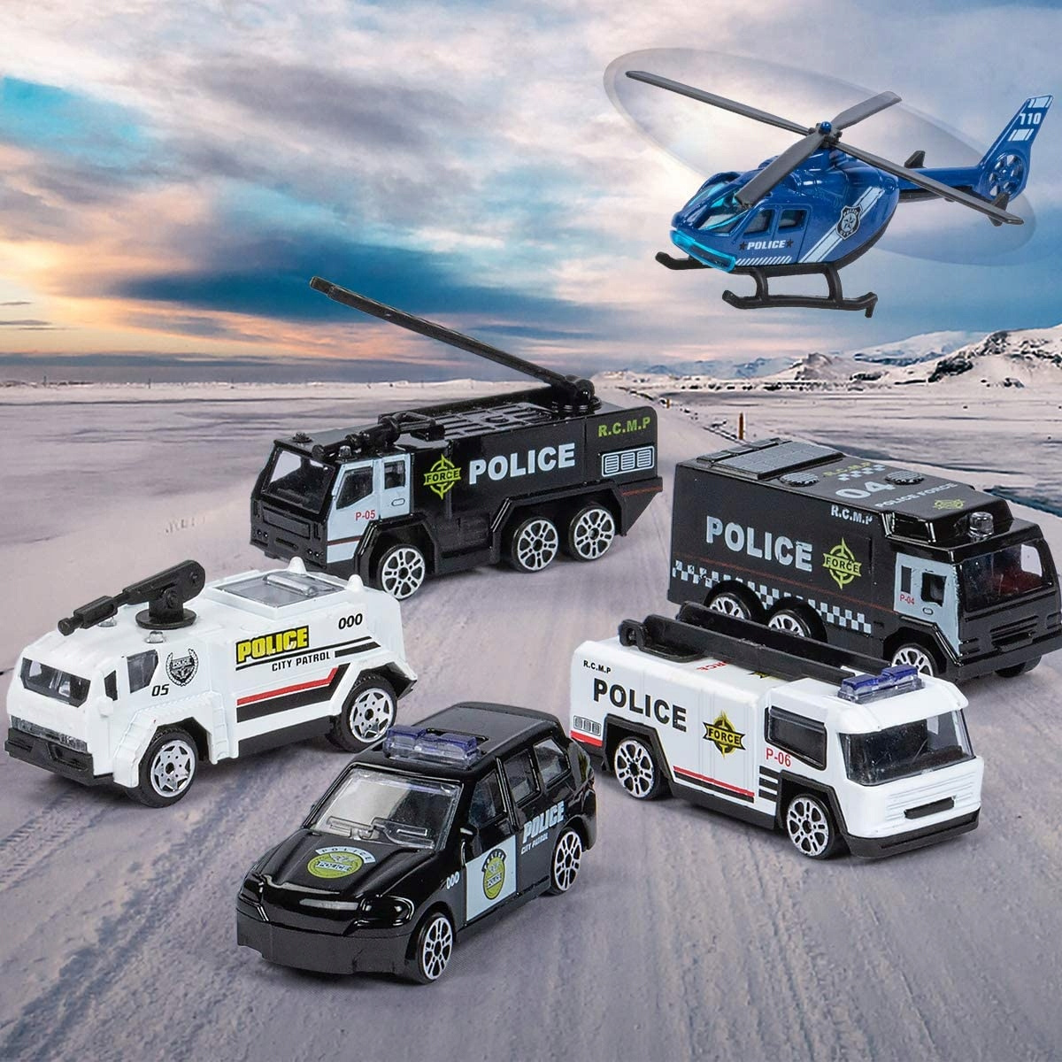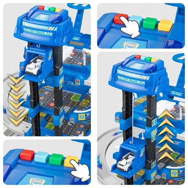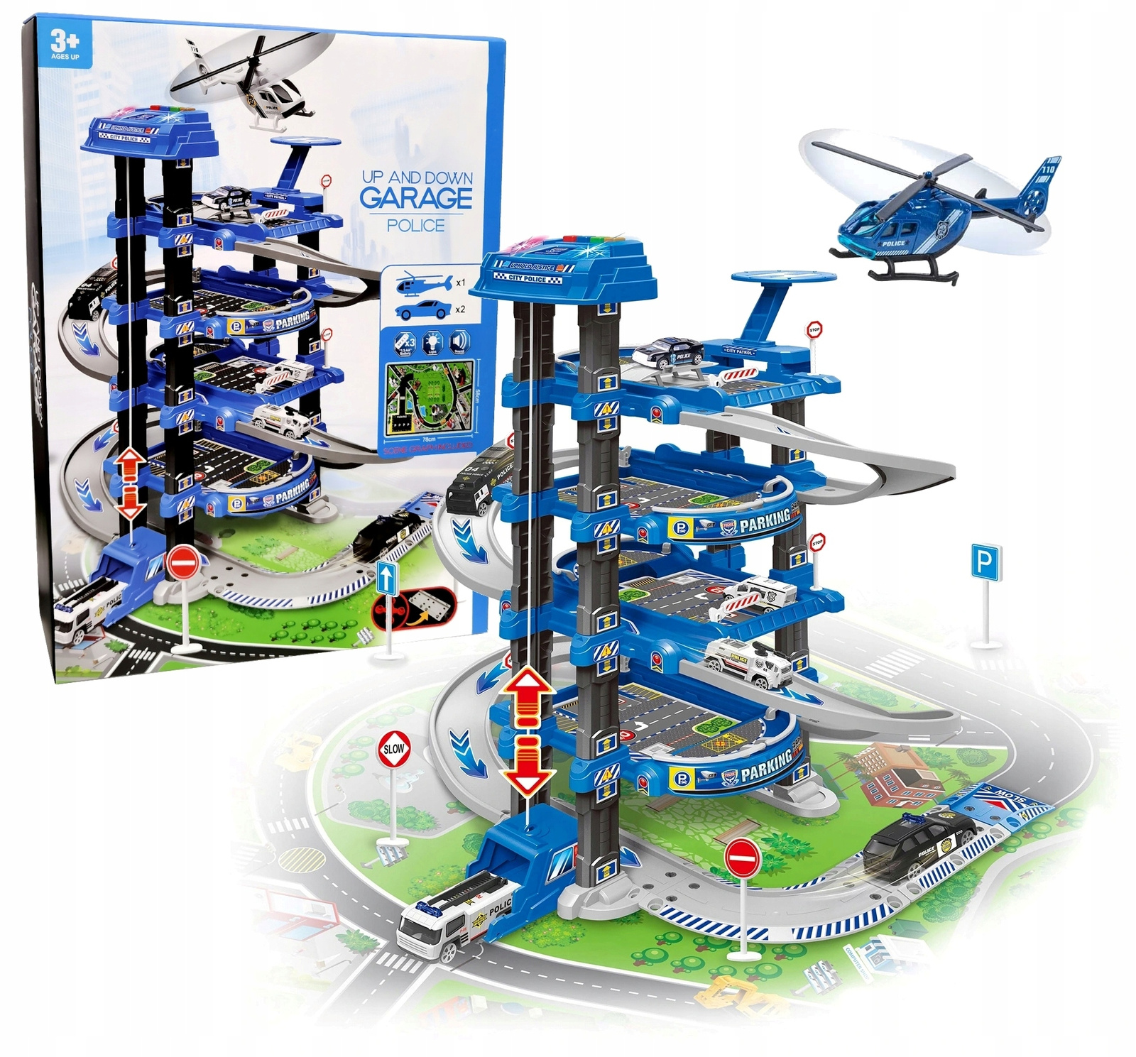 Duży parking policyjny z lądowiskiem dla helikopterów, wyposażony w elektryczną windę oraz realistyczne sygnały dźwiękowe i świetlne. Do zestawu dołączono matę o wyglądzie prawdziwego miasta, dwa metalowe wozy policyjne oraz helikopter. Zestaw składa się z 78 elementów.