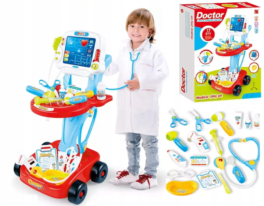 Wózek Małego Lekarza Niebieski – Zestaw Lekarski Dla Dzieci z 17 Elementami