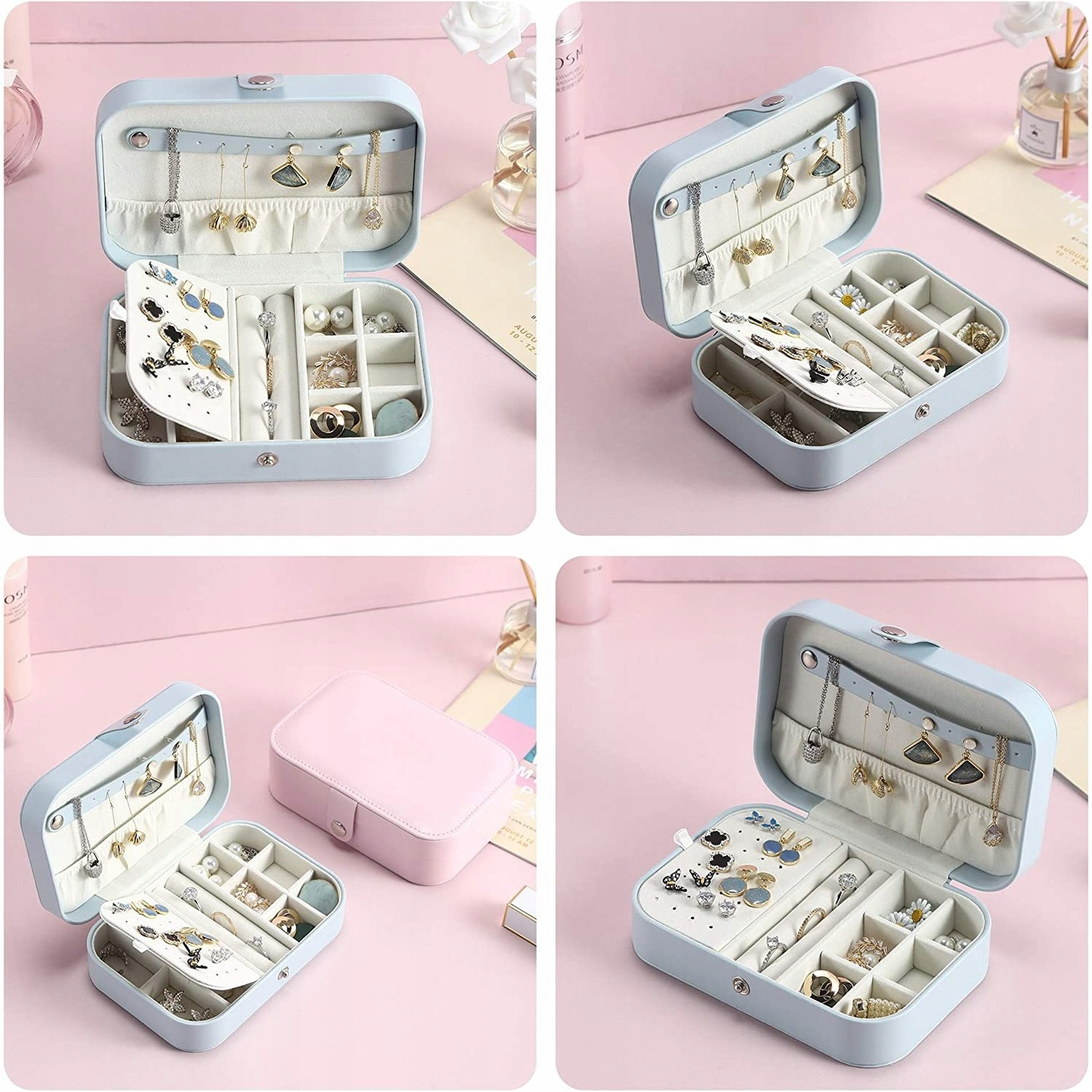 Mniejsze, przenośne pudełko na biżuterię zamykane na zatrzask. Może być małą szkatułką na biżuterię dla dziewczynki lub podróżnym organizerem na biżuterię.