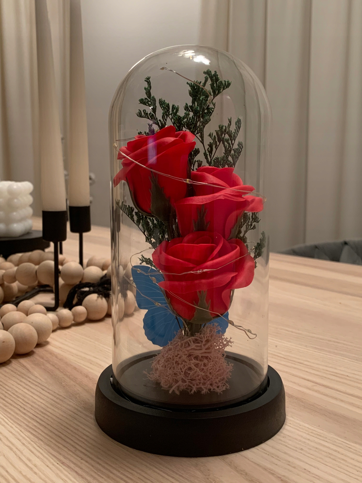 Szalenie romantyczna i elegancka czerwona potrójna sztuczna róża wyglądająca jak prawdziwa w kopule szklanej, z ciepłym białym oświetleniem LED.