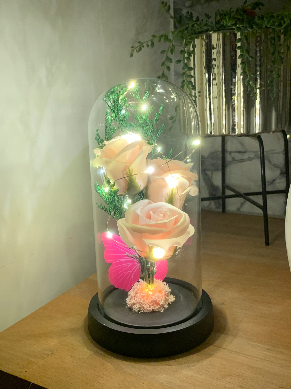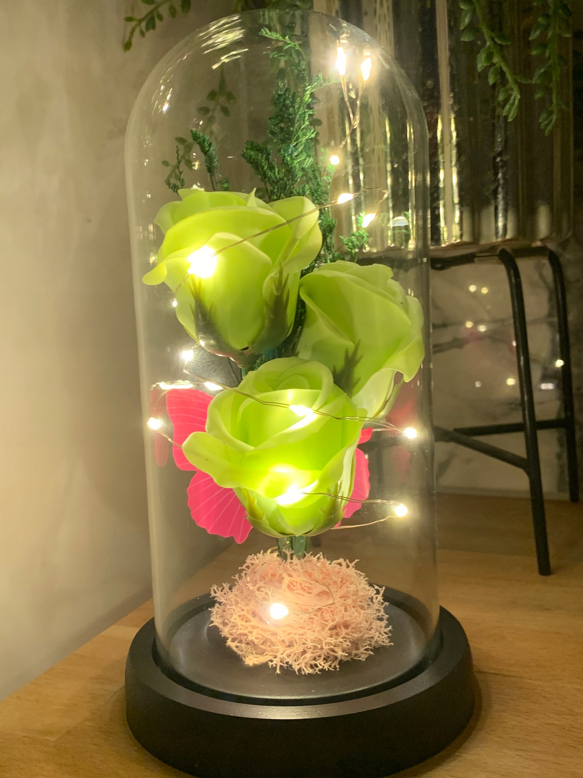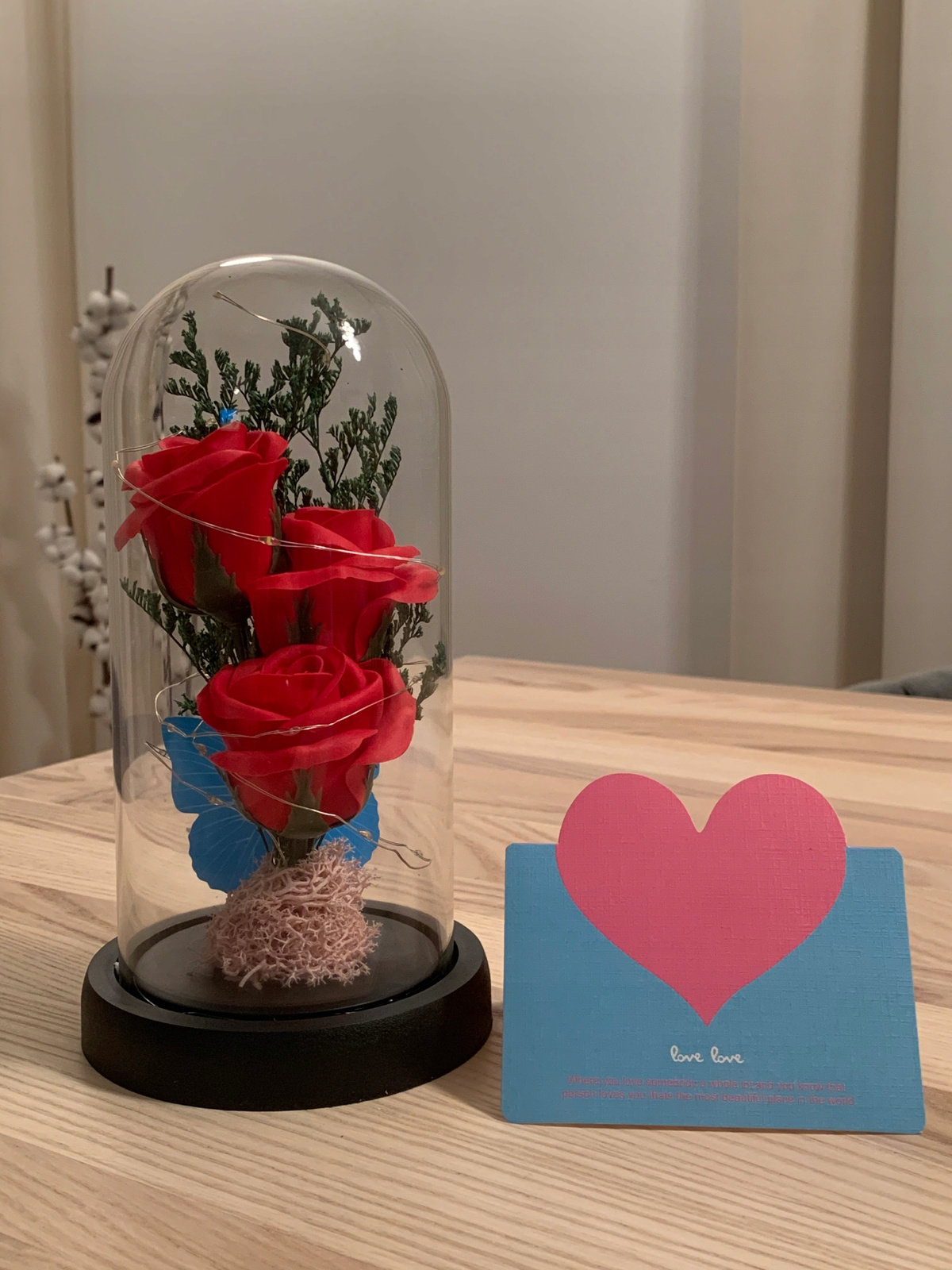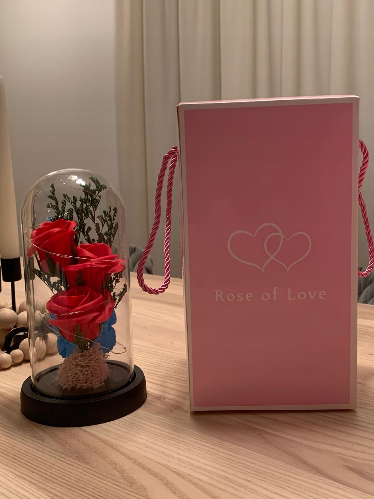 Ta precyzyjnie zrobiona róża, symbol miłości, została umieszczona w szklanej, pięknej kopule, przez którą widać cały czas jej piękno, nawet po ciemku, gdyż rozświetla ją 20 światełek LED , którymi jest oplatana.
