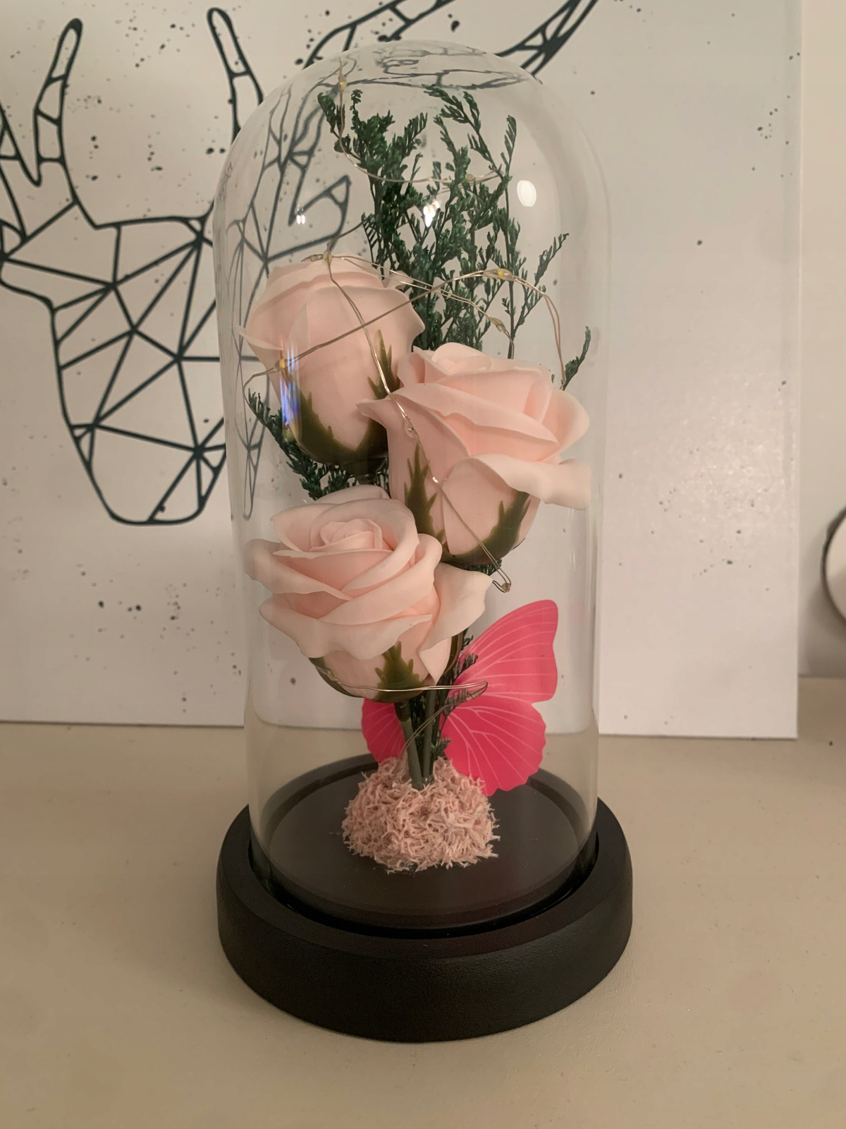 Żywa róża cięta zwiędnie po kilku dniach, a ta nie, a w dodatku ma piękne oświetlenie i przeźroczystą kopułę szklaną - dzięki temu stworzy na zawsze piękny nastrój w pokoju !